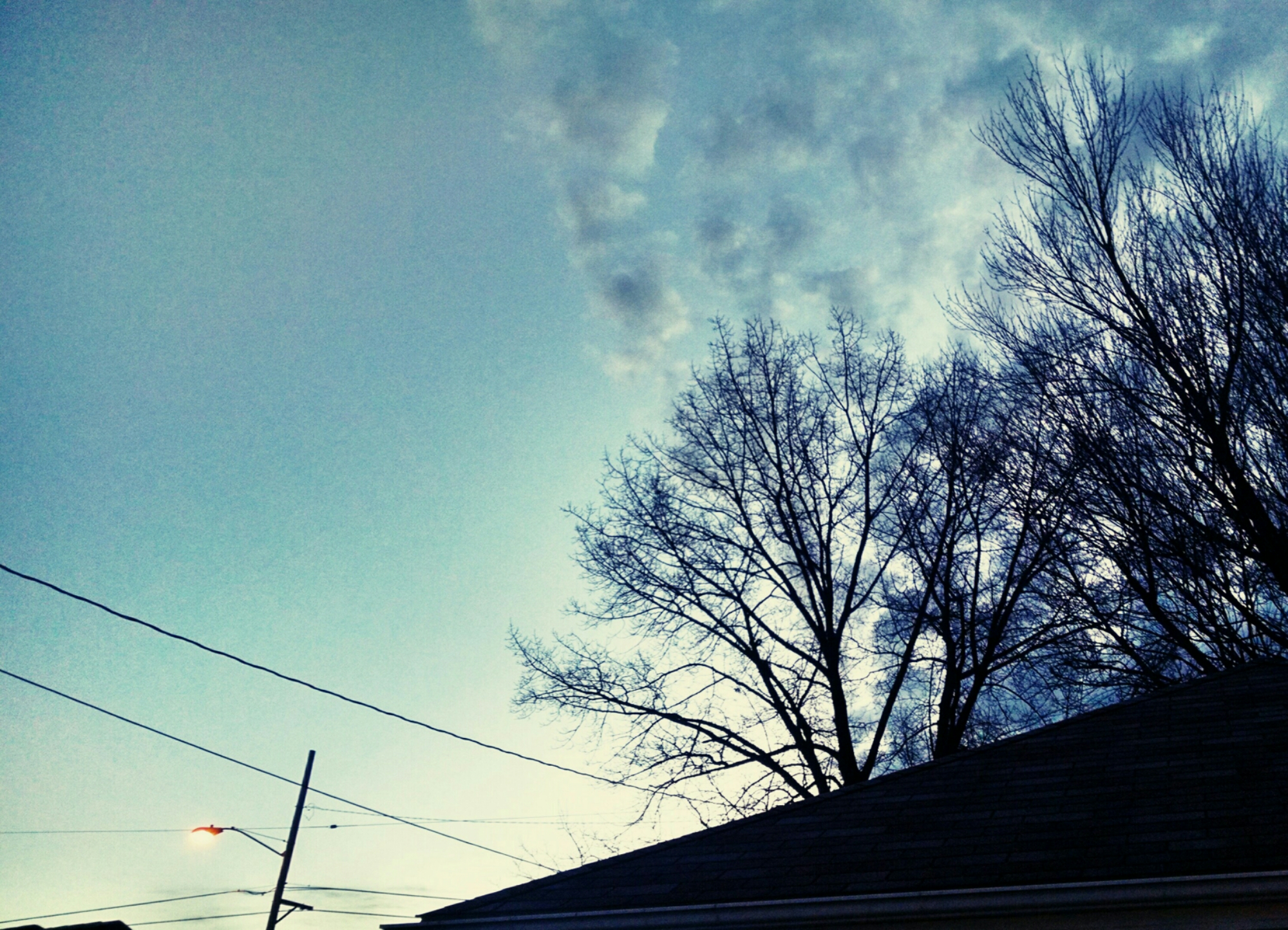 Backlighting exposes each feathering of the maple’s budding branches. The oak, straight back, has yet to begin its spring push, and for that lingering dormancy its limbs appear crooked and tangled with the puffs of cloud catching the indirect light of the sun washing in from the right.